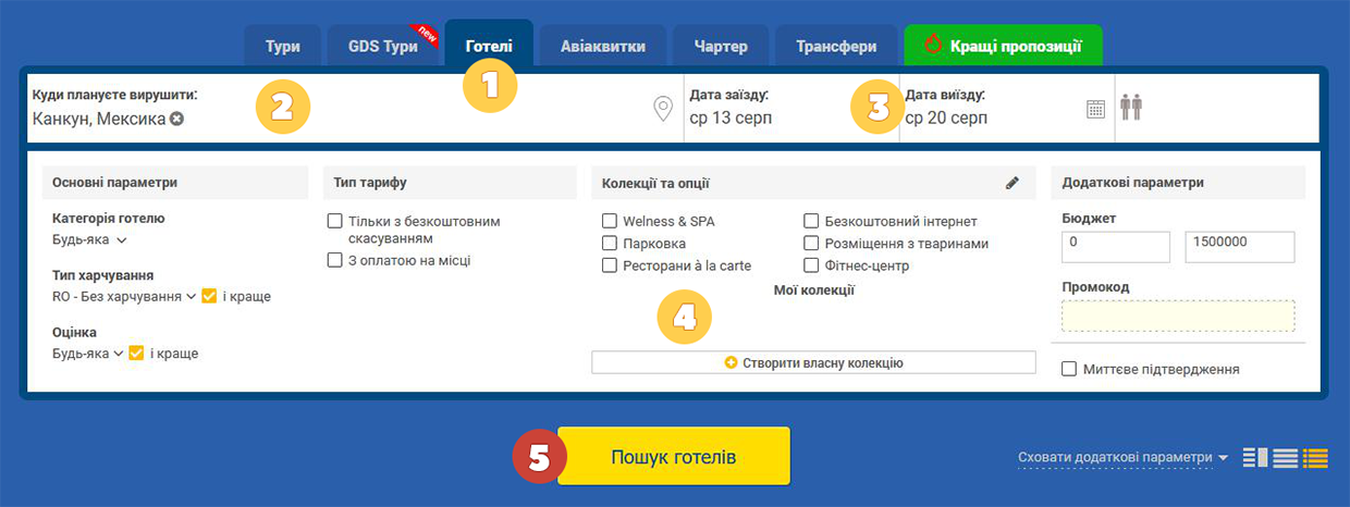 Після внесення необхідної інформації слід клікнути на кнопку «Пошук готелів» під формою пошуку або відповідну піктограму та дочекатися отримання результатів.